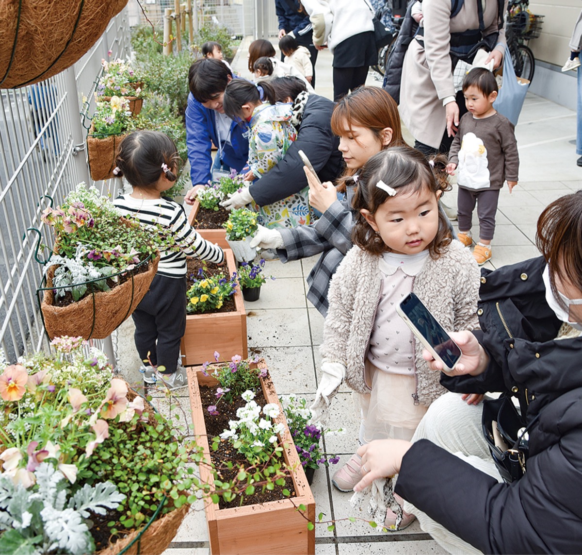 同センターを利用する親子らが、新たに設置されたプランターなどに手作業で花を植え、花壇を完成させた。今後は同センターの入り口や併設する保育園の園庭などに、彩り豊かなプランターやハンギングバスケットなどが飾られる。