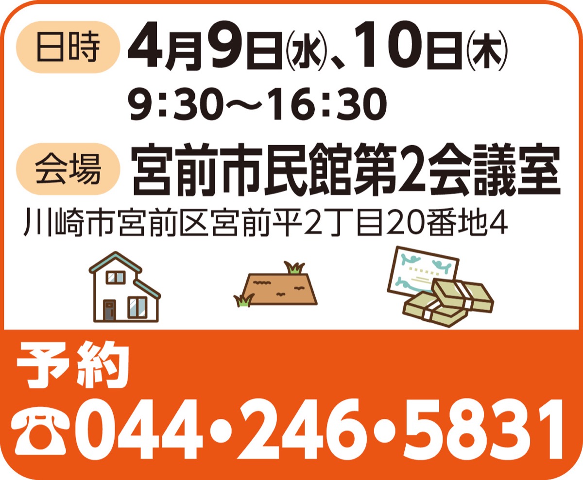 地元の税理士、司法書士、宅建士による「川崎市相続無料相談会」が4月9日(水)、10日(木)、宮前市民館で開催される。要予約。午前9時30分〜午後4時30分。