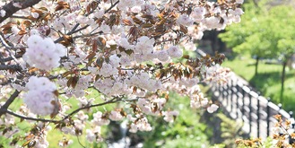 同広場は、地元の平瀬川流域まちづくり協議会が中心となり、自治会や商店街、学校などが約30年前に20種約40本の桜を植樹。川沿いには、淡紅の大輪を咲かせる普賢象や、京都市の平野神社に原木のある妹背、花弁がややらせん状にならぶ渦桜など豊富な種類の八重桜が楽しめる。