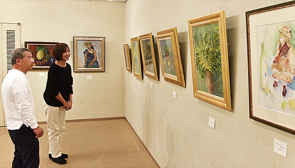 同会は、美術団体・東光会に所属する水野澄子さんが講師を務め、毎月3回ほど市民館実習室で活動している。静物や人物のほか、近郊への写生なども実施。現在は12人が活動している。会員の一人は「少人数だが、油彩、水彩、アクリル、パステルなど好きな画材を選べる自由さが特徴」と話している。