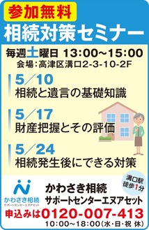 溝口の「かわさき相続サポートセンター エヌアセット」は、好評の無料講座「第26期 相続対策セミナー」を5月に行う(毎週(土)・全3回)。