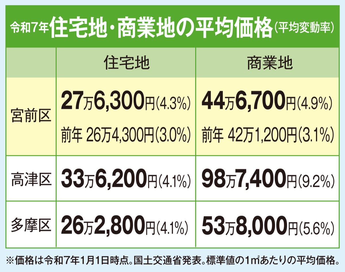 国交省が今年3月に公表した令和7年の公示地価で、川崎市は全ての区で上昇し平均変動率は4・4%と上昇率が拡大。宮前区は4・3%で、交通利便性の高い住宅地を中心に需要が堅調で、起伏のある地勢やバス圏でも地価上昇が見られた。商業地の変動率も4・9%で大幅に上昇。