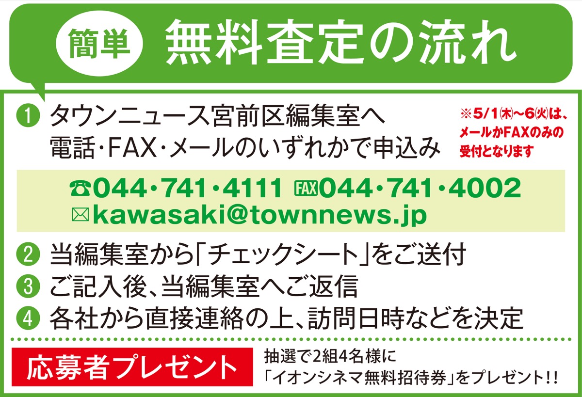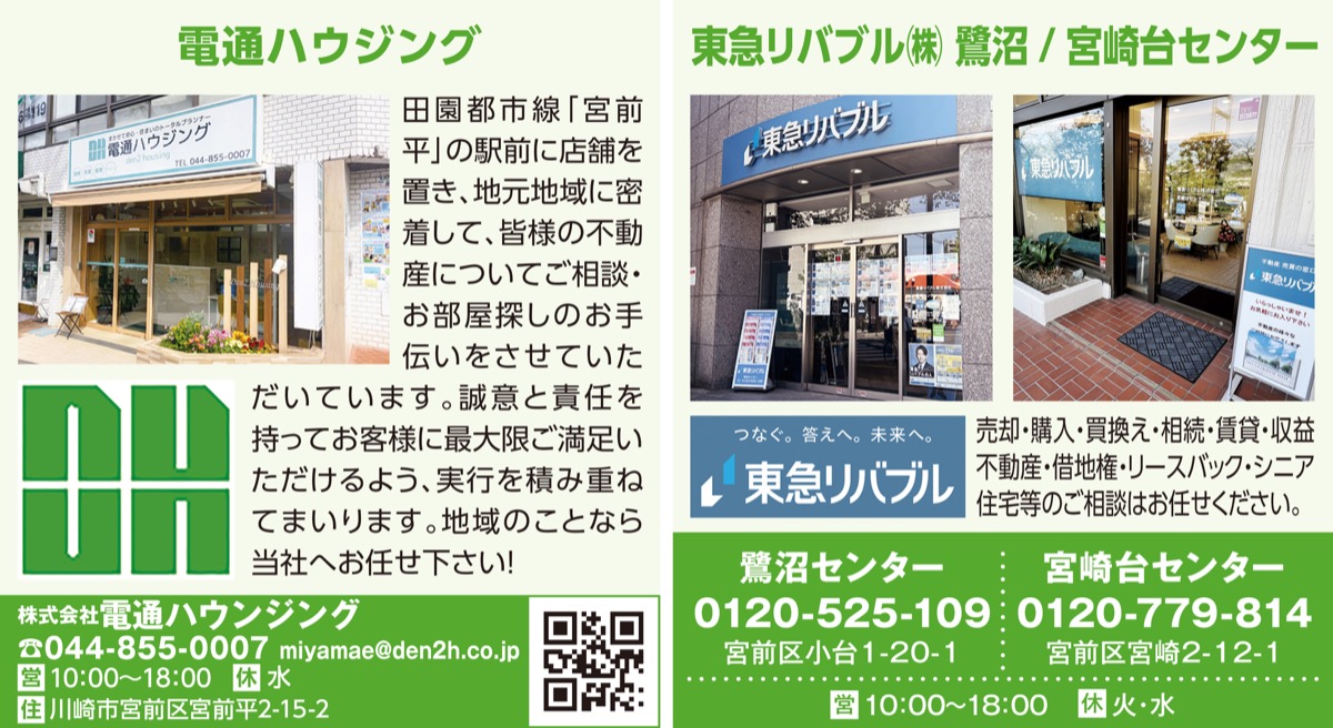 本紙では春の特別企画として、不動産大手の2社(東急リバブル鷺沼センター/宮崎台センター、電通ハウジング)と協力し不動産を無料査定。本紙が取り次ぎ複数社一括で依頼することで、自宅の資産価値を比較でき、各社の視点を踏まえ今後の住まいや不動産全般の相談も可能。まずは当編集室へお問合せを(下記)。