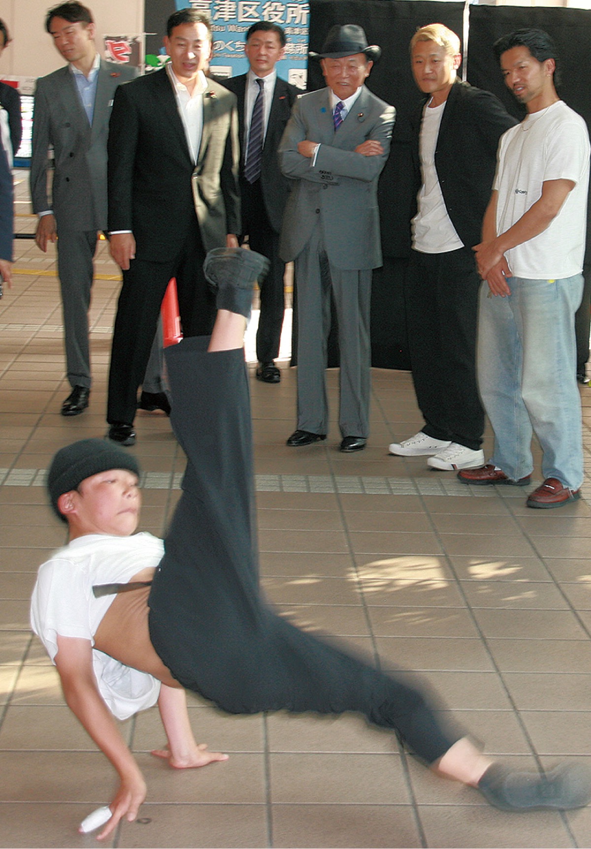 当日、夕方過ぎに地元選出議員らと共に姿をみせた麻生氏は、次々と披露される若者たちの美技に見入り、時折「すごいね」「とんでもないね」などと感嘆の声。川崎市のブレイキン文化を築き、昨年、川崎市文化賞を受賞した石川勝之さんからの「(当地で)ダンス文化が広まった経緯」などについての説明に、耳を傾けていた。