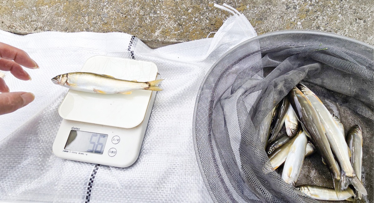 この試し釣りは、多摩川におけるアユの遡上数や成長具合の調査を目的としたもの。当日は高津地区の組合員5人が、東名高速道路下から新二子橋までの計4地点で約3時間にわたって竿をふるった。今回の釣果は5人での合計35匹。サイズは平均14センチ程度で、最大は18センチ、52グラムだった。