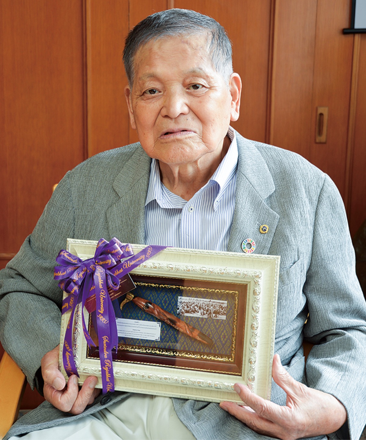 「SDGs」が叫ばれる前から環境問題に熱心に取り組んできた山田会長。タイ王国では1980年から、神奈川県青少年協会や自身が所属する川崎富士見ライオンズクラブのメンバーと植林活動に取り組んできた。長年の功績が認められ、2015年にはタイ王国の皇太子(現ラーマ10世)から「名誉博士号」を授与された。そして昨年、植林活動に携わるラチャパット大学からも感謝の品が贈られた。「開発の影響で砂漠化が進んでいたが、だんだん緑が増えてうれしい。活動を次世代に託していきたい」と思いを述べた。