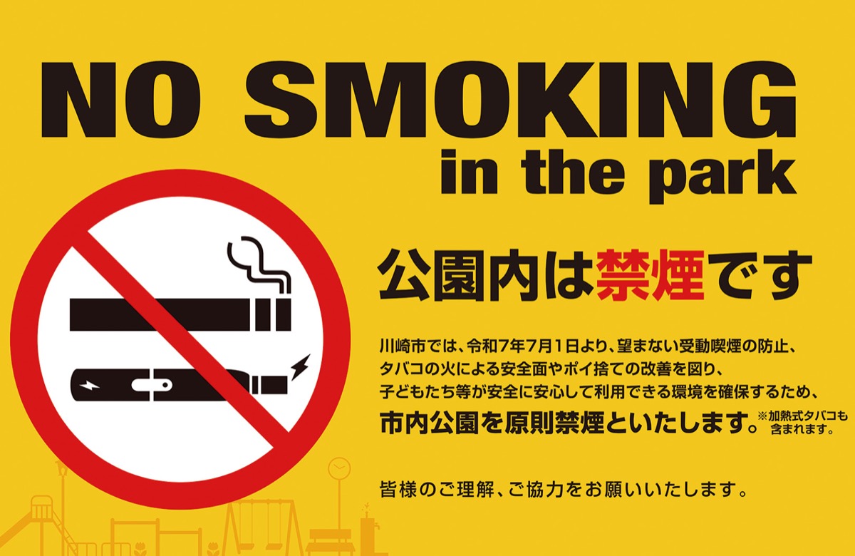 川崎市内の公園が7月1日から、原則として全面的に禁煙となった。一部の公園に設置された「喫煙可能スペース」以外では、公園敷地内での喫煙行為は、来年4月以降に過料の対象となる。