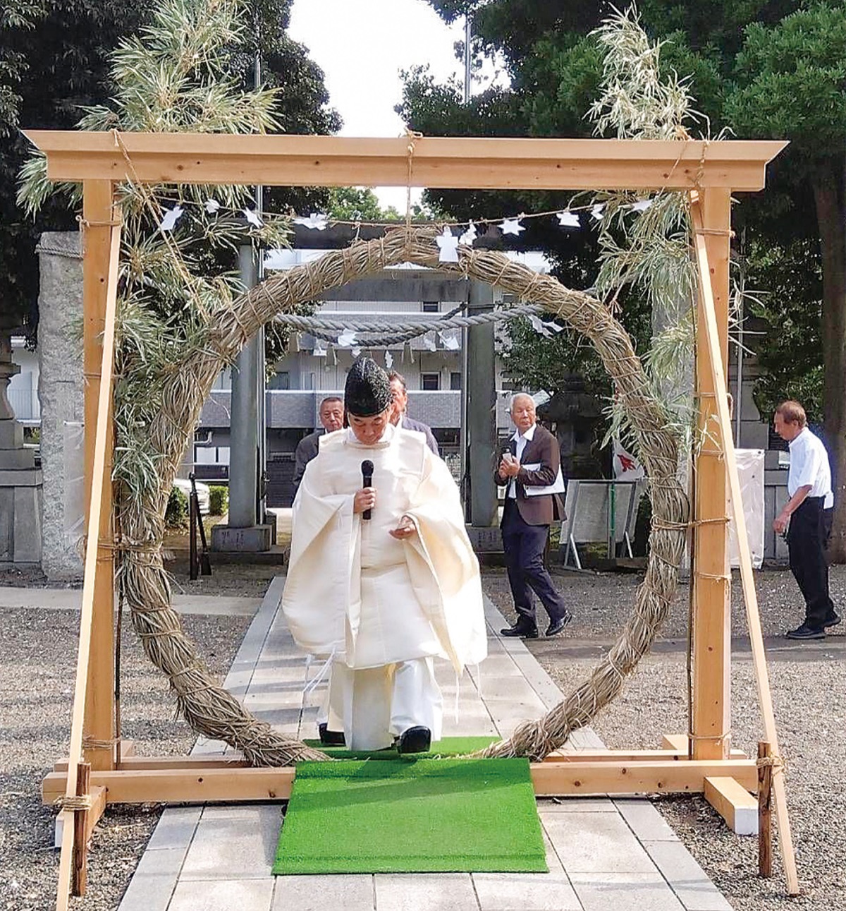 1年の折り返しとなる6月29日、野川神明社(石川正人宮司)で、かやで作られた大きな輪をくぐる「夏越の祓」が行われた。