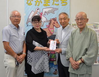 この日は井田良一実行委員長と、長尾の里あじさい保存会の井田光政会長、妙楽寺の溝江光運住職が宮前区社協の事務所を訪問し、川田和子会長に目録を手渡した。川田会長は「まだまだ社協の認知度は低い。会の周知など区内の社会福祉のために使わせていただく」と謝辞を述べた。