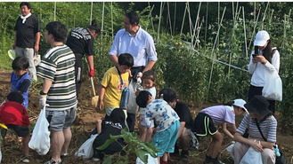 子どもたちに土に触れる機会を提供しようと、社会奉仕団体・川崎富士見ライオンズクラブ(目代健次会長)は7月6日、同クラブのメンバー・山田眞三さんの所有する畑(平)に川崎愛児園の児童を招いて、ジャガイモ掘りのアクティビティーを行った。