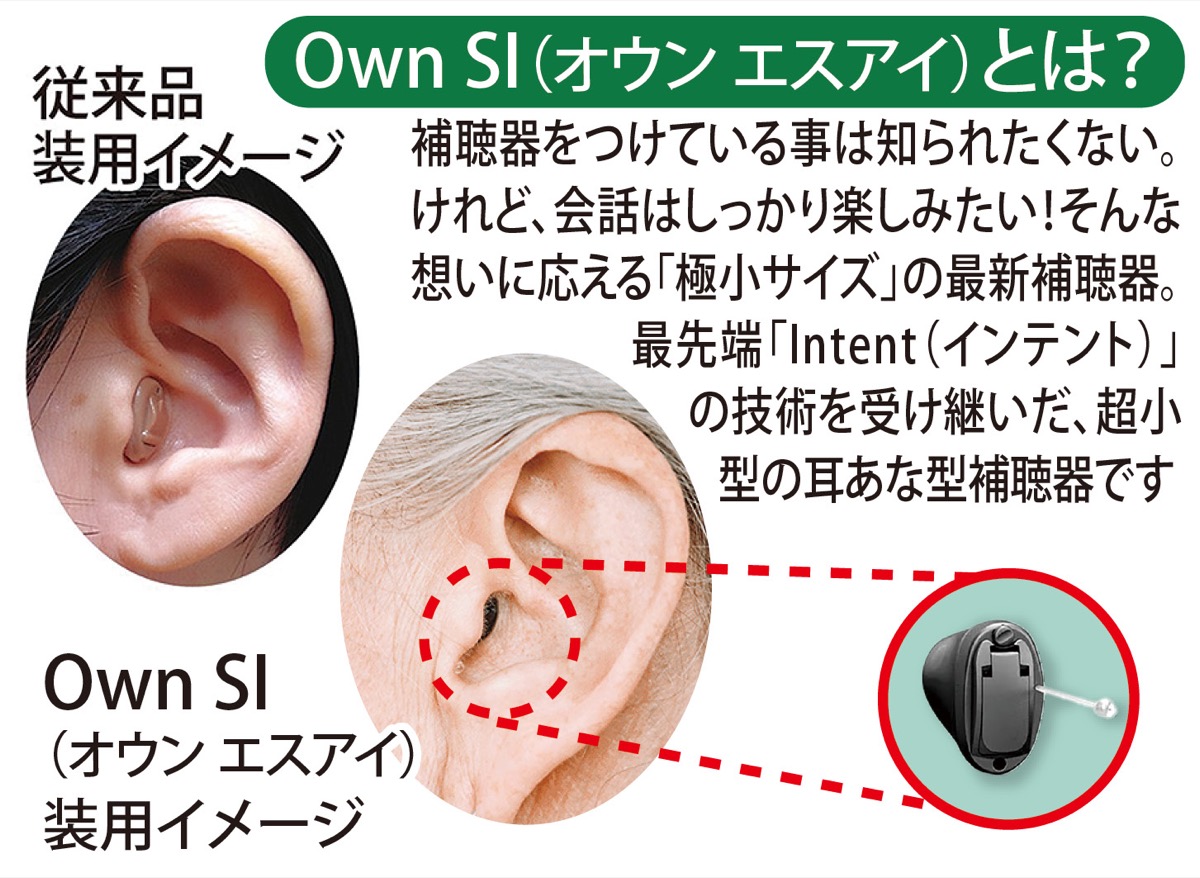 そんな同店が今、推奨しているのがデンマークのメーカー「オーティコン」の目立たず自然に聞こえる最新耳あな型補聴器「Own SI(オウンエスアイ)」=写真左=。この製品は脳が自然に音をとらえて働けるようサポートする「ブレインヒアリングテクノロジー」という技術を搭載しているのも特長の一つ。同店の三浦咲乃店長は「最新の高性能機種でお出かけや会話をより楽しんで頂けます。本紙を見た方はオーダー貸出も無料でご利用頂けますのでぜひご予約の上、来店を」と呼び掛けている。