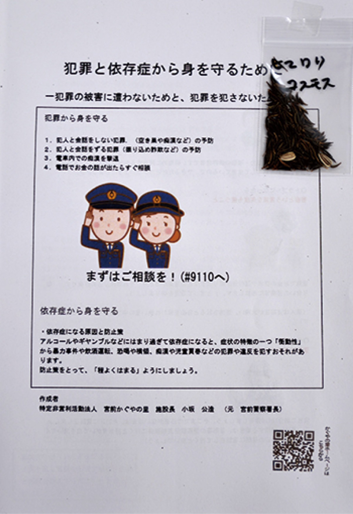 「怖さを知った人は罪を犯したくないので、依存から抜けだそうとするかも知れない」との思いから、冊子「犯罪と依存症から身を守るために」を作成しました。花の種を添えて、施設のほか、アリーノ、宮前区役所向丘出張所、福祉パルなどで無料配布しています。