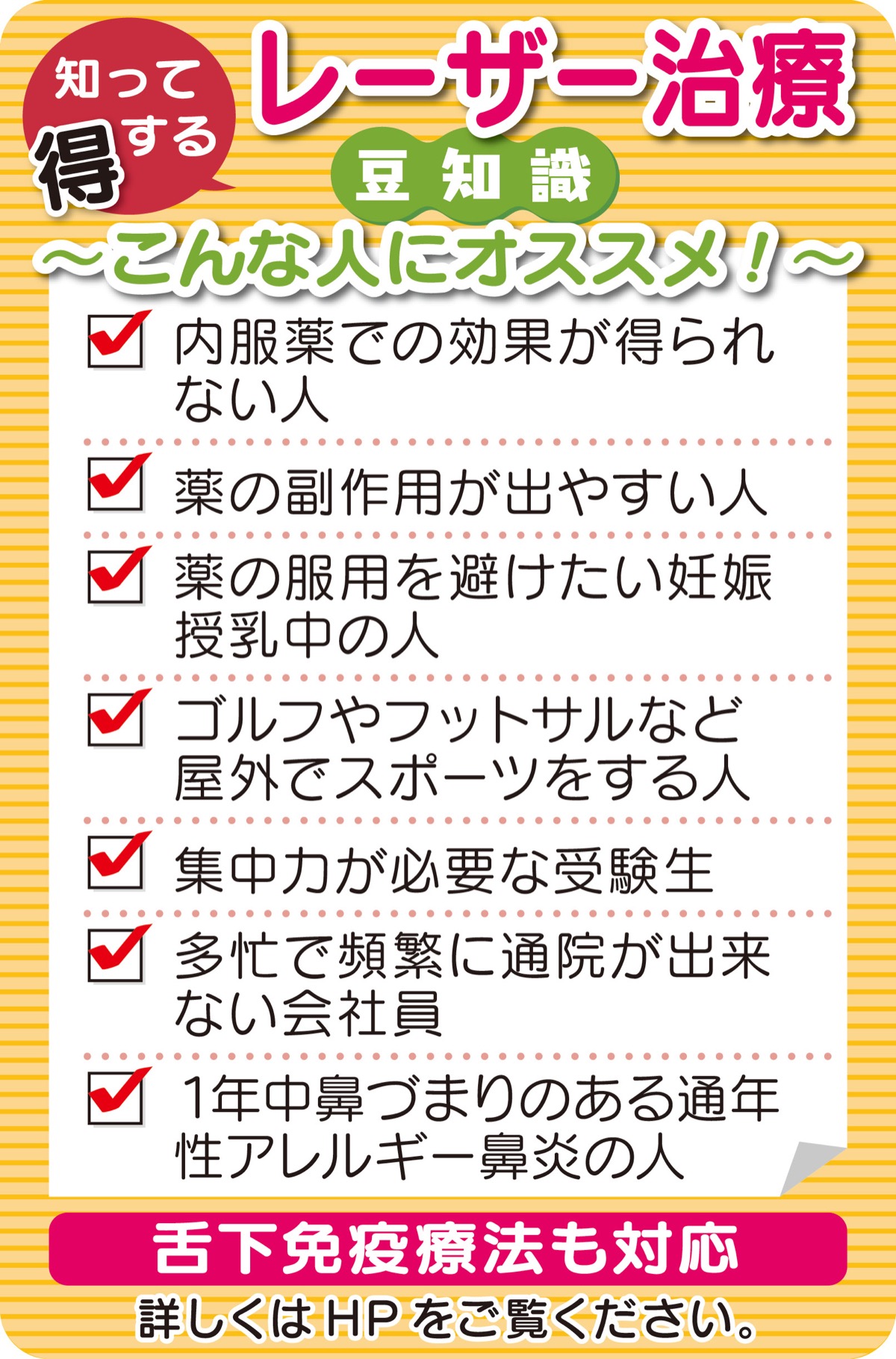 レーザー治療とは鼻の粘膜にレーザー光を照射し、アレルギー反応を抑える治療。鼻づまり・鼻水・くしゃみなどの症状の緩和に高い効果と持続性が期待できるという。「痛みや出血もほとんどありません。効果を実感して定期的に施術される方も多くいらっしゃいます。安心して治療をうけていただきたい」と菅野院長。