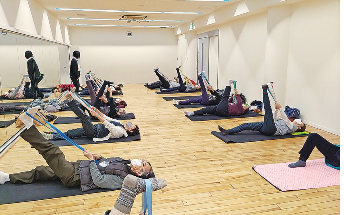 後半は室内でマットに横になりながらストレッチ。ゆっくりと体をほぐして、心までリフレッシュする。いつまでも元気な脚腰で自立した生活を続けたい、健康寿命を延ばしていきたいという人におすすめだ。