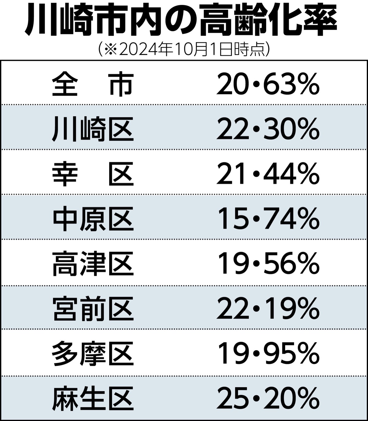 市が今年4月にまとめた「市高齢者施策状況」では、2024年10月1日時点の高齢者人口は32万117人で、総人口に占める高齢化率は全国平均(29・2%)より大幅に低い20・63%。高齢化率が高い地区は麻生区で25・20%、低い地区は中原区で15・74%だった。