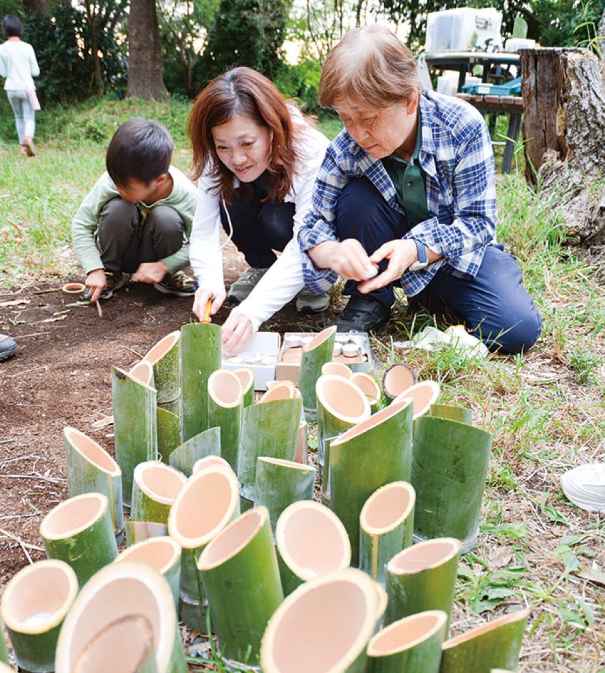南野川ふれあいの森で9月27日、竹灯籠づくりと夜の探検が行われた。南野川特別緑地保全地区管理運営協議会(野川はあも)の活動の一環として実施されたもので、約30人が参加した。