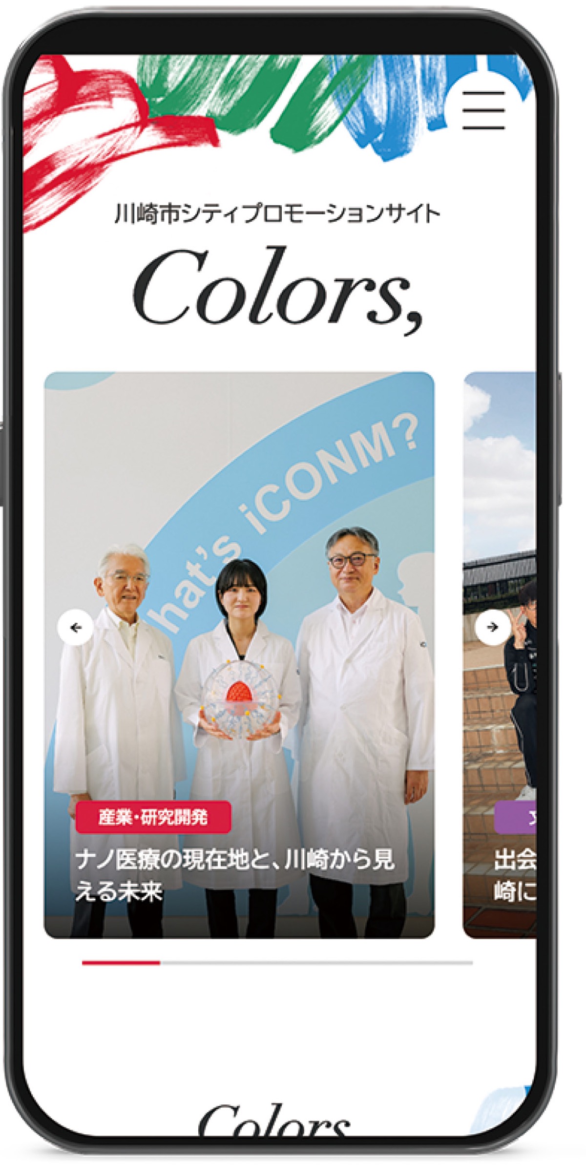 サイト内には、川崎にまつわる知られざるデータをクイズ形式で伝えるコーナーも掲載し、市制100周年に展開した100人インタビュー企画「かわさきって、人だよね。」も収録した。「Colors,」制作を手掛けた同室担当者は、「川崎に暮らし、働く人たちの姿を伝える内容にこだわった。通勤時などに1本ずつ読んで、川崎の魅力を知ってほしい」と話している。