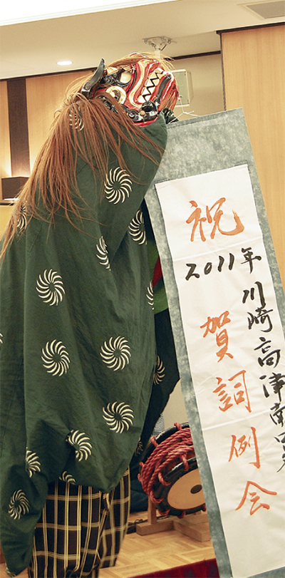 川崎高津南ロータリークラブ(長戸はるみ会長)の賀詞例会が17日にホテルKSPで行われ、その中で”新春獅子舞・おはやし”が披露された。演舞は区内の諏訪神社祭囃子保存会(鈴木伸一会長)。