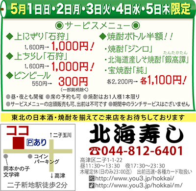 北海寿しでは5月1日(日)〜5日(木)まで16周年感謝企画を開催。上にぎり・上ちらし(各1600円)が各1000円に、内200円は東日本大震災の被災地への義援金となる。震災発生直後から被災地応援企画も行っている同店。4月18日現在、7万4783円を現地へ送った。