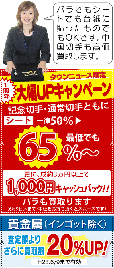 郵便局で切手の現金化はできないため、買取専門店に相談するのが賢い知恵。同店では、例えば切手シートの総額に対し、タウンニュース限定で65%以上の金額で査定してくれる。
