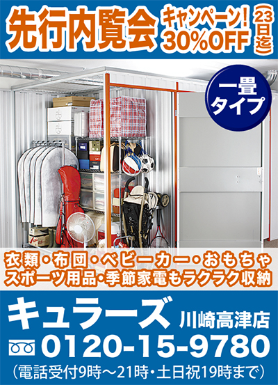 話題の最新型トランクルーム「キュラーズ川崎高津店」が8月25日にオープンする。トランクルームキュラーズは快適収納を提案し、全国展開中。2年連続でオリコン満足度1位を獲得している。今回オープンする川崎高津店は、高津駅から徒歩7分、駐車場完備。ビル内にあり、店舗スタッフが常駐。24時間出し入れ自由、荷物の保管に最適な温度と湿度で管理され、最新セキュリティシステムも導入している。女性の夜間利用も心配ないのが嬉しい。料金はBOXタイプ2660円〜。1カ月の短期利用も可。敷金・礼金・管理費一切不要だ。