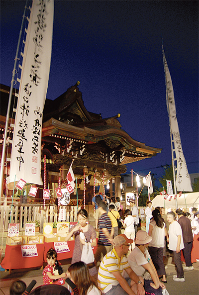前夜祭の抽選会参加券を求める列は大山街道まで延びるほどの盛況ぶりで、抽選会ではこの日最高潮の盛り上がりを見せた。やきとり、イカ焼き、射的、あんず飴などの昔懐かしい露天には浴衣姿の子どもたちが集まり嬉しそうな歓声をあげていた。ほかにも、明治時代から同神社に現存する国内ケヤキ1本をくり抜き作られた直径三尺六寸(約110センチ)の曳太鼓が披露されるなど、子どもも大人も笑顔溢れる祭となった。