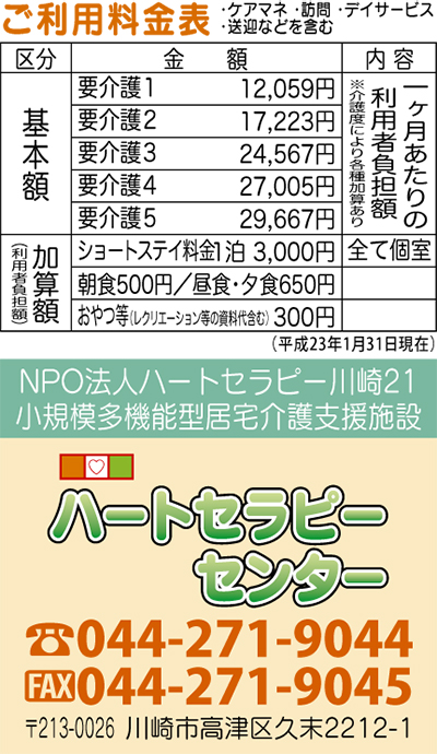 2006年に設立され、高津区や中原区、宮前区、多摩区などからの利用者がいるハートセラピーセンターは、家族の介護を経験した代表者が運営している。