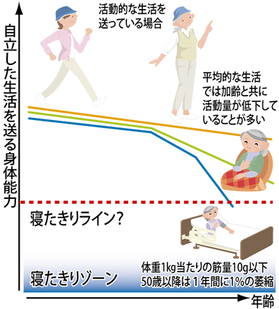 プログラムでは特に、他の筋力と比べ低下が著しい脚筋力と腹筋力に着目。なぜなら加齢とともに筋力が低下すると、立ち上がる、歩く、階段を昇るといった動作がスムーズに行えなくなる。もし転倒するなどして骨折し、運動できない状態が続くと、さらに運動機能が落ち、寝たきり生活になることも少なくないからだ。体重1kgあたり10g以下の筋量になると歩けなくなるという。
