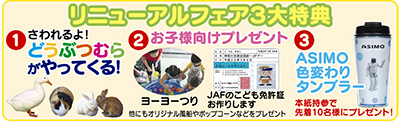 「スタッフが考えた楽しい企画が盛りだくさん」と話すのは小山尚美店長。フェアではウサギやアヒルなどの小動物と触れ合える動物村が開かれるほか(11時から16時)、ヨーヨーつりやJAFこども免許証がつくれるブースなどを設置。車用品のアウトレット市を開催する。風船やポップコーンなどの”お子様プレゼント”も用意されており、「お気軽にご来場を」と小山店長。さらにタウンニュース本紙持参で、飲み物の温度でタンブラーの色が変わりアシモが現れる「アシモ色変わりタンブラー」を先着10人にプレゼント!