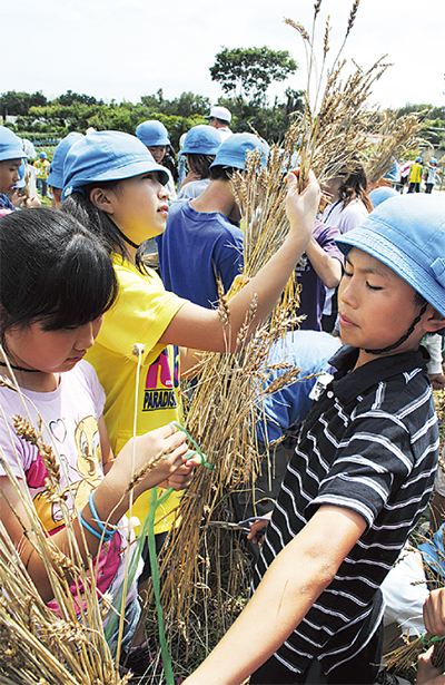 前年同時季、当時の6年生から刈り入れの方法を教わった現6年生。久村大輝君は作業を終え「楽しかった。5年生が(作業を)ちゃんとやっていたので、(方法が)伝わったと思う」と話していた。