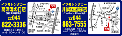 イツモレンタカー高津溝の口店:川崎市高津区二子3-29-5 イツモレンタカー川崎宮前店:川崎市宮前区馬絹1454-1