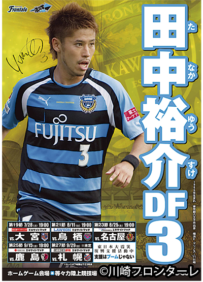 新ポスターはDF田中裕介選手が登場。同選手のサインとともに7月28日(土)の大宮戦から9月29日(土)の札幌戦までの5試合を紹介している。