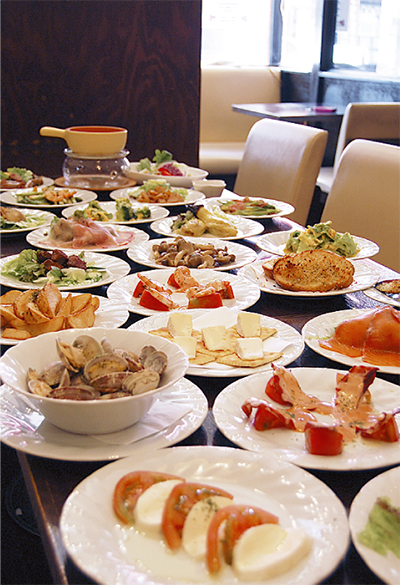 アペロールと前菜を楽しむセットは800円(7月27日〜9月6日)。前菜は「ホタテのムニエル」「アスパラと小エビのソテー」「ムール貝の香草焼き」など、20種以上から2品をチョイス。アペロールをグラスワイン、または前菜1品に替えることもできる。