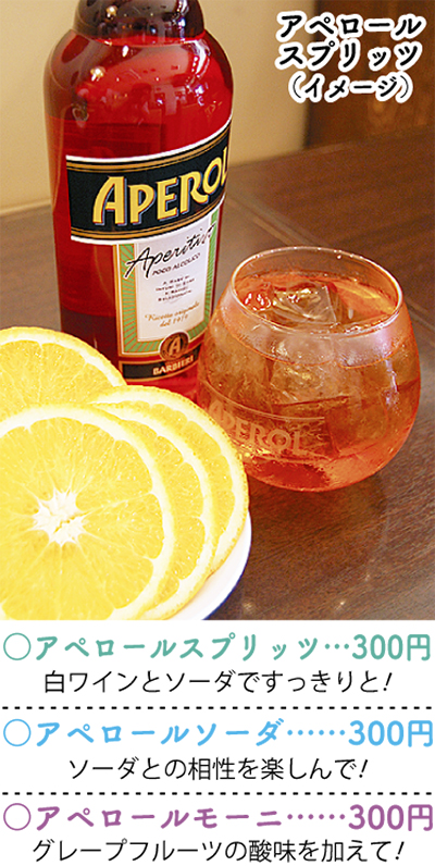 白ワインとソーダで割る「アペロールスプリッツ」、ソーダで割ってレモンを添える「アペロールソーダ」、グレープフルーツとソーダでフルーティに仕上げた「アペロールモーニ」と、楽しみ方はいろいろ。各300円。