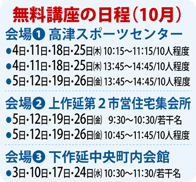 対象は60歳以上で医師から運動を禁止されていない方、定員は各会場若干名。会場と日時は左表の通り。参加者には運動した履歴を数値化して記録できる「貯筋通帳」が発行される。参加にあたっては運動しやすい格好で、水分補給できるもの、タオルを持参。