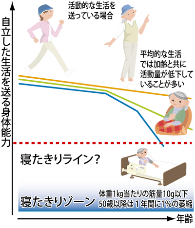 加齢とともに筋力が低下すると、立ち上がる、歩く、階段を昇るなどの動作がスムーズに行えなくなることから、プログラムは脚筋力と腹筋力に着目した内容。