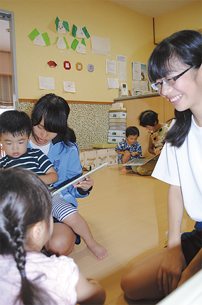 すぐに園児と打ち解けた生徒達の様子に石野幸子園長は「まずは体を動かして園児と一緒に遊んで、時には注意するなど臨機応変を身につけて」。代表の青木しづ子さんは「『楽しい』だけでなく、親が自分にしてくれたことを想い、感謝の気持ちを持ってもらいたい」と見守っていた。
