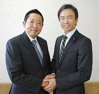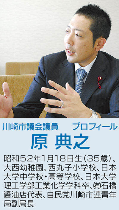 高津区選出の青木のりお市議(自民党)が、中原区選出の原典之市議(自民党)と対談。子どもを幼稚園に通わせる育児中のパパで、年齢は35歳。消防団に所属し、あだ名も”のり”と、何かと共通点が多い2人が、まちづくり委員会前委員長・副委員長の立場から、川崎市のまちづくりについて思いを語った。