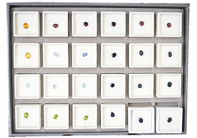 ルビー(ビルマ・南アフリカ産)、サファイア(ブルー・ホワイト・ピンク・グリーン・イエロー)、アクアマリン、トルマリン、スピネルを1ケース3000円から20000円までの割引価格で提供する。