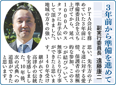 式典後の祝賀会では、参加者同士が記念の節目を祝い、10年後、20年後も盛大に式典ができるように、高津小学校と地域の発展を誓い合った。