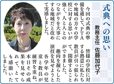 記念式典を今年度開催するにあたり、約3年前から記念事業実行委員会(斉藤眞弘委員長)は教師や児童、PTA、同校OB・OGと一体となって開催準備を進めてきた。体育館で行われた式典には来賓や学校関係者ら約400人が来場、華やかなオープニングで幕が開けた。