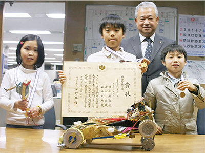 3人は、昨年11月に東京工業大学大岡山キャンパスで行われた「第3回全国少年少女チャレンジ創造コンテスト」(公益社団法人発明協会主催)にチーム「ドラゴンスター」として参加し、特許庁長官賞を受賞。出品したモーターとゴムで動くハイブリットカーの性能とデザイン性が高い評価を受けた。