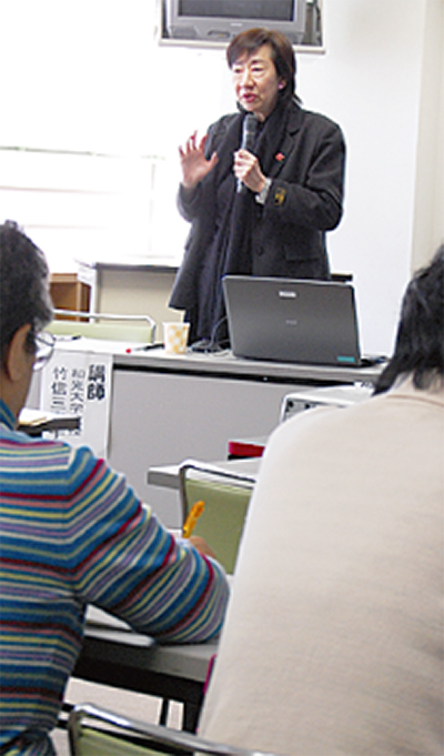 プライバシーが確保できないだけでなく、性暴力の恐怖にもさらされるなど、竹信さんは避難所での女性特有のさまざまな問題を指摘。「女性リーダーを養成し、女性の声を反映できる環境をつくることが必要。女性支援には男性の理解もとても大切」と、講演会に参加した男女約30人に呼び掛けた。
