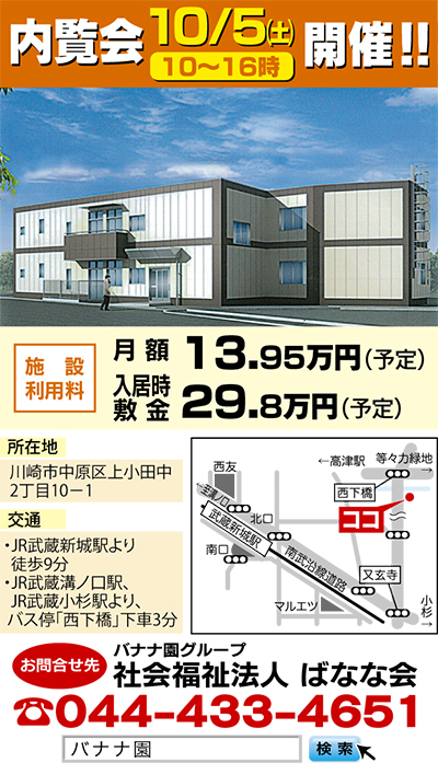 15年以上にわたる認知症介護の実績、川崎市内に9施設ある「バナナ園グループ」が11月、新たにグループホーム『のんびりーす等々力』をオープン。等々力緑地に程近い閑静な住宅街に立地し、住環境も充実。24時間体制で、温もりある家庭的な雰囲気の中、経験豊富なスタッフが大切なご家族をサポートする。