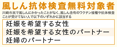 川崎市は妊娠中の女性が風しんにかかると胎内感染で子どもに先天異常が出る危険を回避してほしいと、市内の医療機関と連携し16日から風しん抗体検査の無料実施を始める。翌年3月31日まで。全市の協力医療機関およそ380カ所で受け付ける。