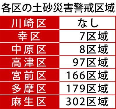 国が01年に土砂災害防止法を施行し、各都道府県が「土砂災害警戒区域」と「土砂災害特別警戒区域」の指定を進めてきた。全国で指定が進まない課題が浮き彫りになっているが、川崎市内では川崎区を除く6区で合計759カ所が警戒区域に指定された。特に丘陵地に宅地が広がる麻生区や多摩区、宮前区、高津区に集中している。