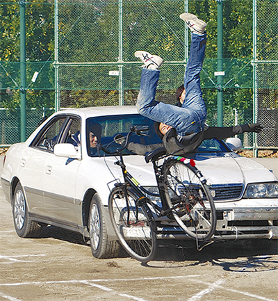 当日は、事故が最も多い速度、時速40、50Kmの自動車と自転車の衝突、大型車両の左折巻き込み事故、歩行者と自転車の衝突などをスタントマンが再現。見学した生徒から、その衝撃の大きさに驚きと悲鳴の声が上がった。