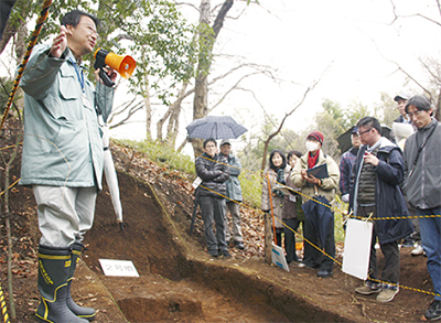 市内で現存する唯一の前方後円墳などの調査が進む蟹ヶ谷古墳群で、川崎市教育委員会は3月7日、現場見学会を開催し、250人が参加した。発掘調査団団長の土生田(はぶた)純之専修大教授は「小雨にもかかわらず、来場者が多くて感激した」と語った。参加者は、新たな周溝の発見などの成果に、熱心に聞き入っていた。