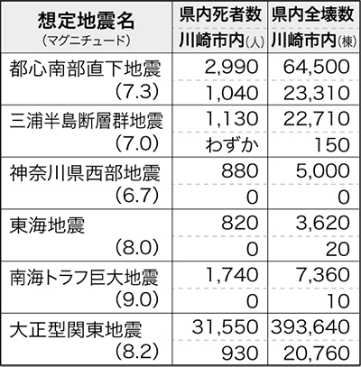 川崎市に最も甚大な被害があると想定されたのはM7・3の「都心南部直下地震」。国の評価では発生確率が30年間で70%とされ、横浜市・川崎市を中心に震度6強の揺れがあると想定した。県内の死者は2990人。川崎市の死者は1040人、建物の全壊は2万3310棟、焼失は1万3500棟にも及び、被害が集中すると予測した。