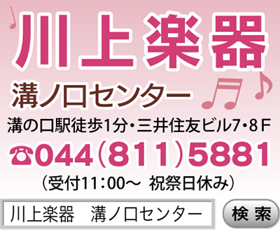 「リズムは音楽の『心臓』です。ドラムできれいにリズムを奏でられると、叩いている側から気持ち良くなります。ビートルズの『イン・マイ・ライフ』など、お好きな曲で楽しさを味わいませんか」。溝口駅すぐ側の「川上楽器 溝ノ口センター」では「昔からやりたかった」とドラムを始める中高年が増えている。現在レッスン生を募集中。話しやすくて親切と好評の島村先生が丁寧に教えてくれる。「初心者でも1日である程度上達できます。お気軽に無料体験はいかが」